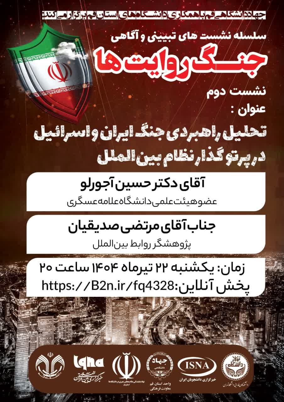 سلسله نشست های تبیینی و آگاهی " جنگ روایت ها" با هدف بررسی جنگ دوازده روزه تحمیلی رژیم صهیونی و آمریکای جنایتکار بر علیه میهن عزیزمان می باشد؛ این نشست ها با حضور متخصصین و متفکرین دانشگاهی بصورت برخط (آنلاین) توسط معاونت فرهنگی واحد استان قم و با همکاری نهاد های فرهنگی و علمی سراسرکشور و بویژه استان قم برگزار می شود.