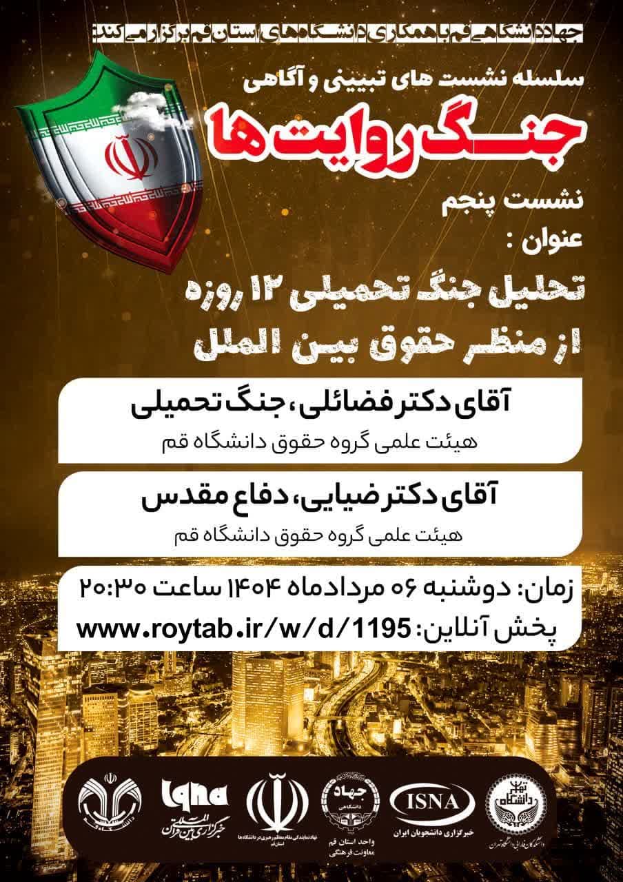 سلسله نشست های تبیینی و آگاهی " جنگ روایت ها" با هدف بررسی جنگ دوازده روزه تحمیلی رژیم صهیونی و آمریکای جنایتکار بر علیه میهن عزیزمان می باشد؛ این نشست ها با حضور متخصصین و متفکرین دانشگاهی بصورت برخط (آنلاین) توسط معاونت فرهنگی واحد استان قم و با همکاری نهاد های فرهنگی و علمی سراسرکشور و بویژه استان قم برگزار می شود