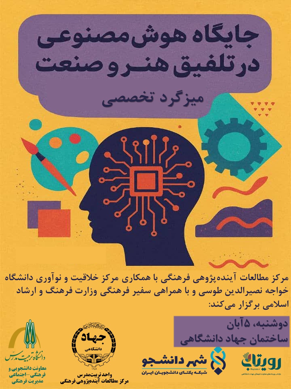 مرکز مطالعات آیندهپژوهی فرهنگی جهاد دانشگاهی واحد تربیتمدرس با همکاری مرکز خلاقیت و نوآوری دانشگاه خواجه نصیرالدین طوسی و با همراهی سفیر فرهنگی وزارت ارشاد اسلامی، مدیر فناوری نشریه رسمی عصر هوش مصنوعی، مدیر فرهنگی و اجتماعی دانشگاه تربیت مدرس نشستی با موضوع جایگاه هوش مصنوعی در تلفیق هنر و صنعت و توسعه هنر در حوزهها و رشتههای گوناگون از طریق نوآوریهای جدید برگزار کند.