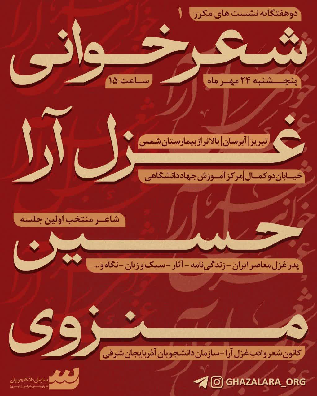 اولین جلسه دو هفتگانه کانون شعر و ادب «غزلآرا» وابسته به سازمان دانشجویان آذربایجان شرقی با محوریت بررسی آثار شاعر معاصر حسین منزوی، با حضور جمعی از اساتید دانشگاه، شاعران، فعالان فرهنگی و اعضای سازمان دانشجویان در سالن جلسات سازمان جهاددانشگاهی آذربایجان شرقی برگزار شد.