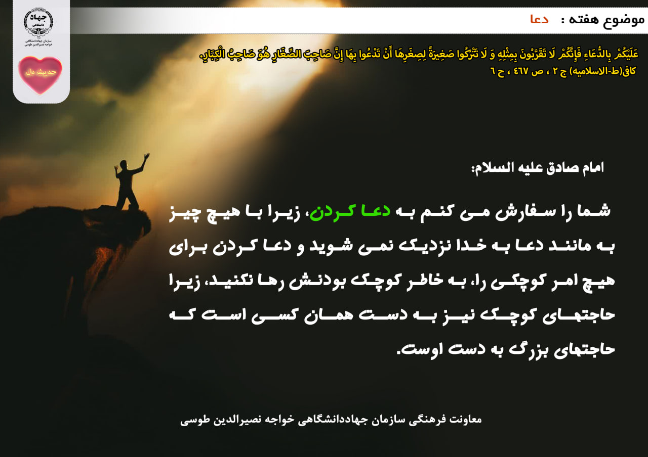 شما را سفارش مى كنم به دعا كردن، زيرا با هيچ چيز به مانند دعا به خدا نزديك نمى شويد و دعا كردن براى هيچ امر كوچكى را، به خاطر كوچك بودنش رها نكنيد، زيرا حاجتهاى كوچك نيز به دست همان كسى است كه حاجتهاى بزرگ به دست اوست.