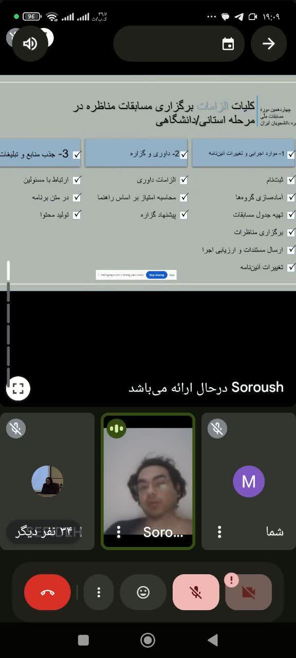 با توجه به نیاز مبرم شرکت کنندگان به جلسه توجیهی جهت شرکت در چهاردهمین دوره مسابقات مناظرات دانشجویی ایران، کارگاه توجیهی در بستر گوگل میت برگزار شد و شرکت کنندگان ضمن آشنایی سوالات خود را مطرح نمودند.