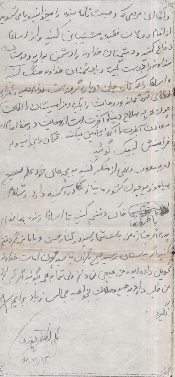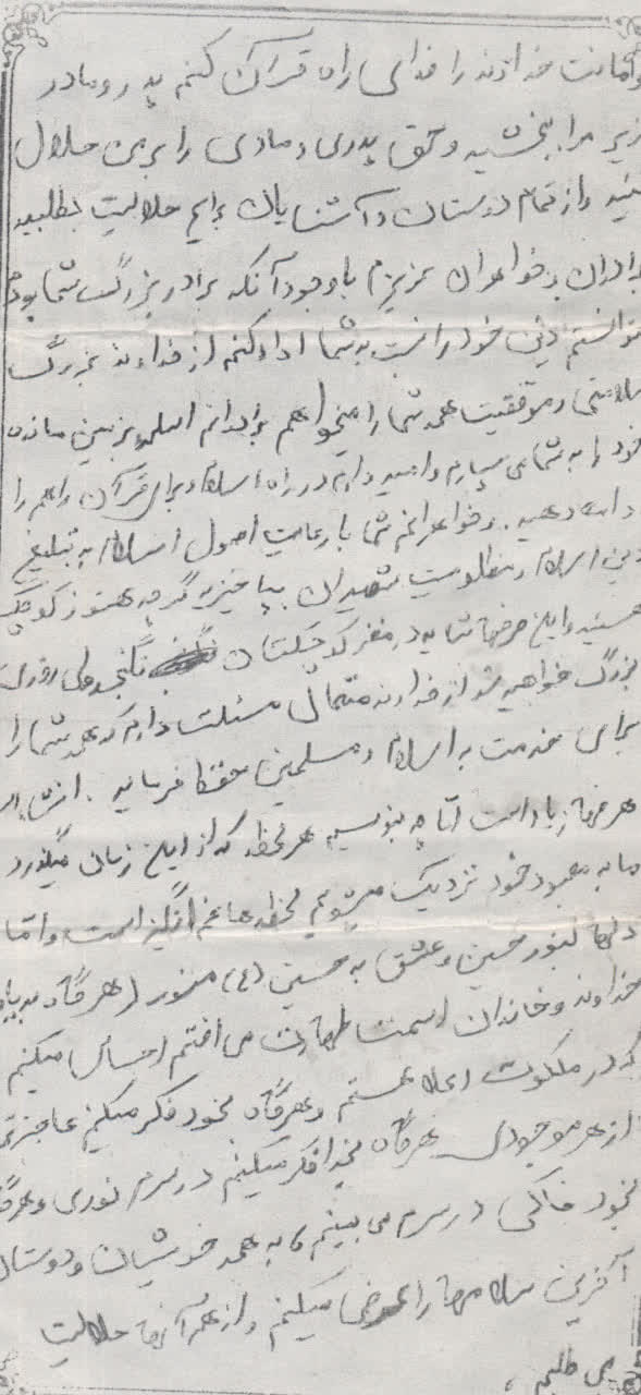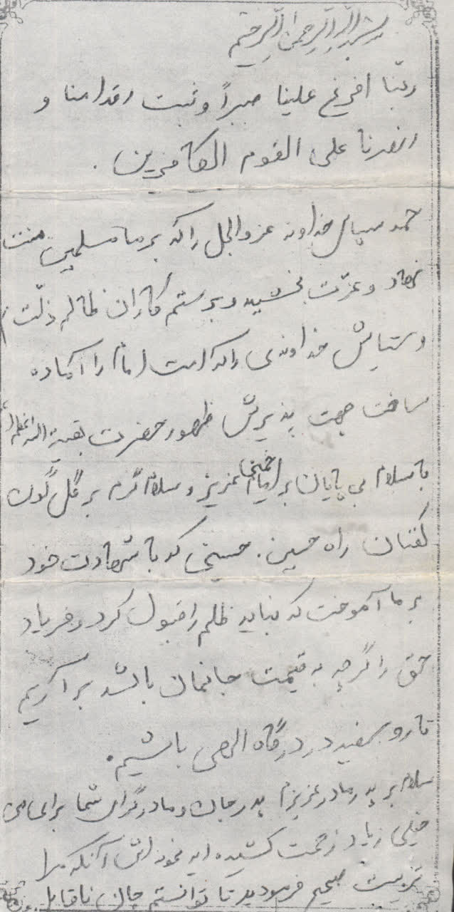 در بخشی از وصیت‌نامه شهید آمده است: با سلام بی‌پایان بر امام خمینی عزیز و سلام گرم بر گلگون کفنان راه حسین، حسینی که با شهادت خود بر ما آموخت که نباید ظلم را قبول کرد و فریاد حق را گر چه به قیمت جانمان باشد برآریم تا رو سفید در درگاه الهی باشیم.