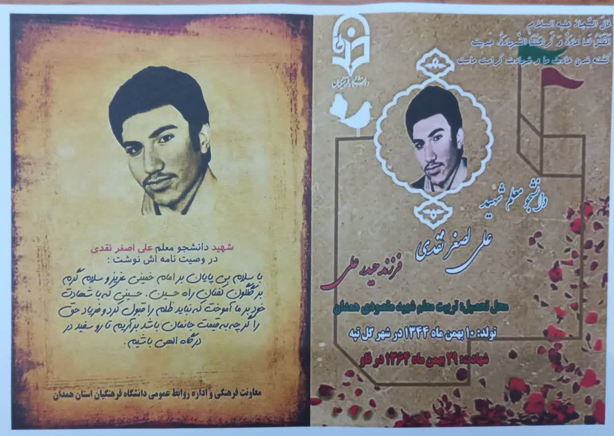 در حاشیه برگزاری طرح «یادِیار» گرامیداشت شهید دانشجو معلم «علی‌اصغر نقدی» در دانشگاه فرهنگیان همدان نمایشگاهی از زندگینامه و وصیت‌نامه شهید برپا شد تا حاضران درمراسم بیشتر با این شهید بزرگوار آشنا شوند.
