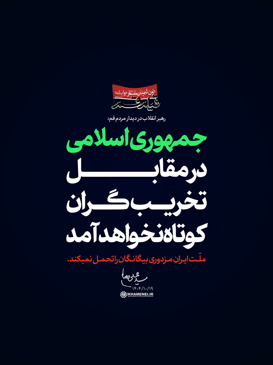 رهبر معظم انقلاب اسلامی ایران  در سالروز قیام نوزدهم دی سال ۱۳۵۶ در دیدار با مردم شهر قم  با تأکید بر اینکه جمهوری اسلامی با خون چند صد هزار انسان شریف روی کار آمده و در مقابل تخریبگران کوتاه نخواهد آمد، گفتند: جمهوری اسلامی مزدوری بیگانگان را تحمل نمی‌کند و ملت ایران مزدور بیگانه را هر که باشد مردود می‌داند.