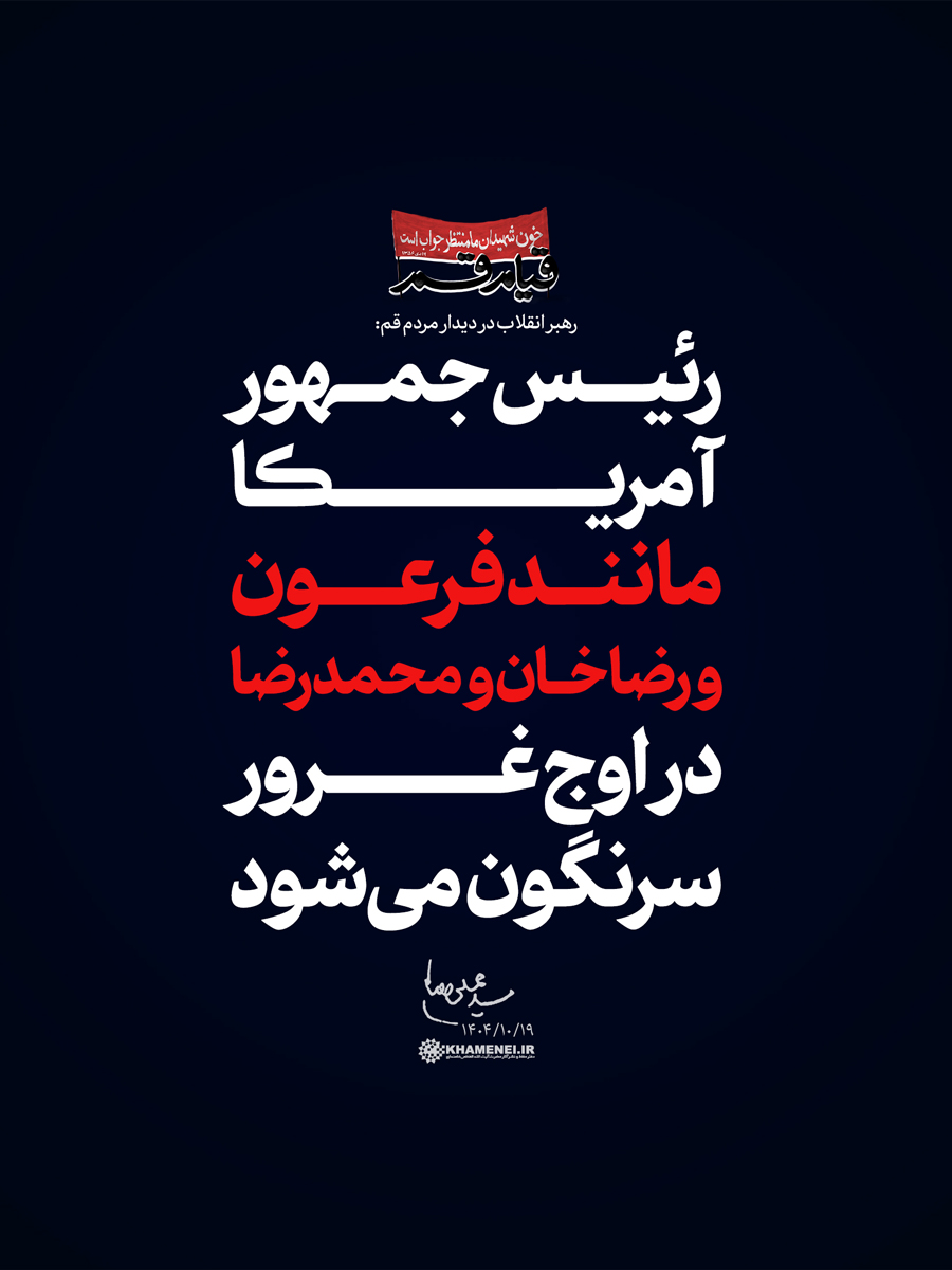 رهبر انقلاب در خصوص رئیس‌جمهور آمریکا گفتند: آن بابایی که با نخوت و غرور راجع به همه دنیا حرف می‌زند و قضاوت می‌کند، بداند معمولاً مستبدین و مستکبران عالم از قبیل نمرود، فرعون، رضا خان و محمدرضا پهلوی وقتی که در اوج غرور بودند سرنگون شدند و او هم سرنگون خواهد شد.