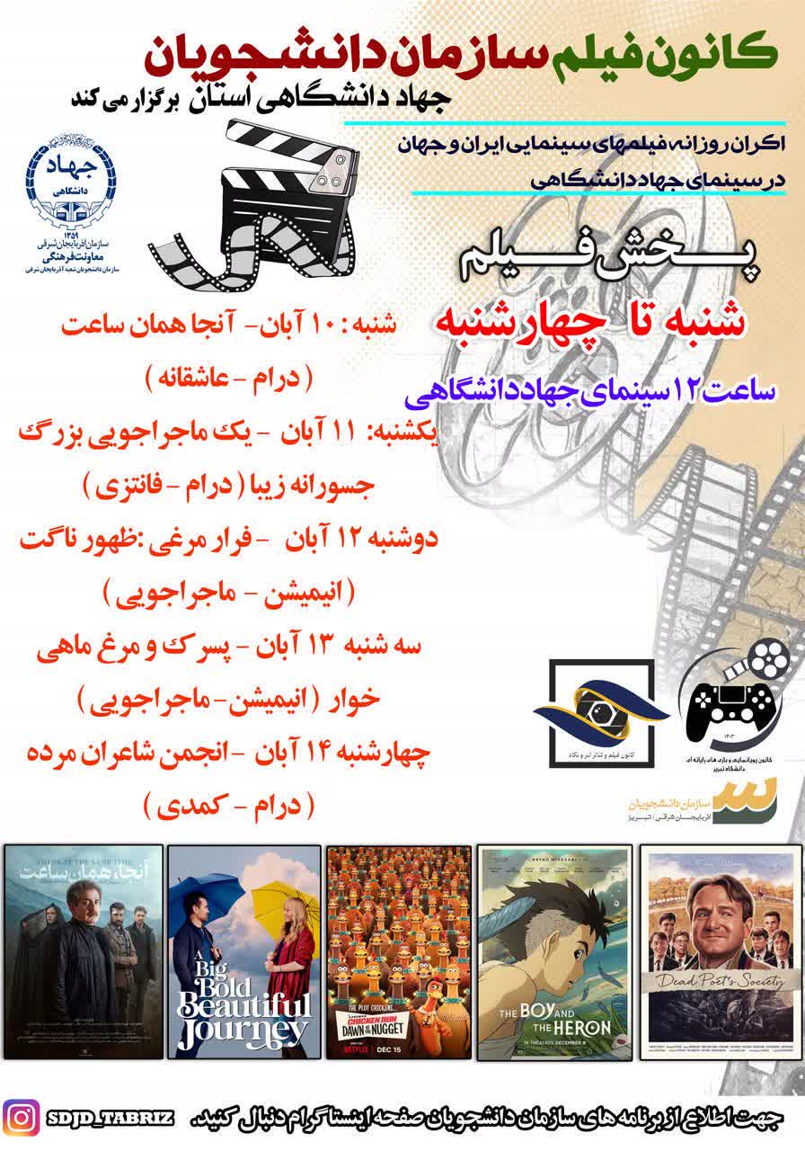 🎬کانون فیلم سازمان دانشجویان جهاددانشگاهی استان آذربایجان شرقی برگزار می کند.