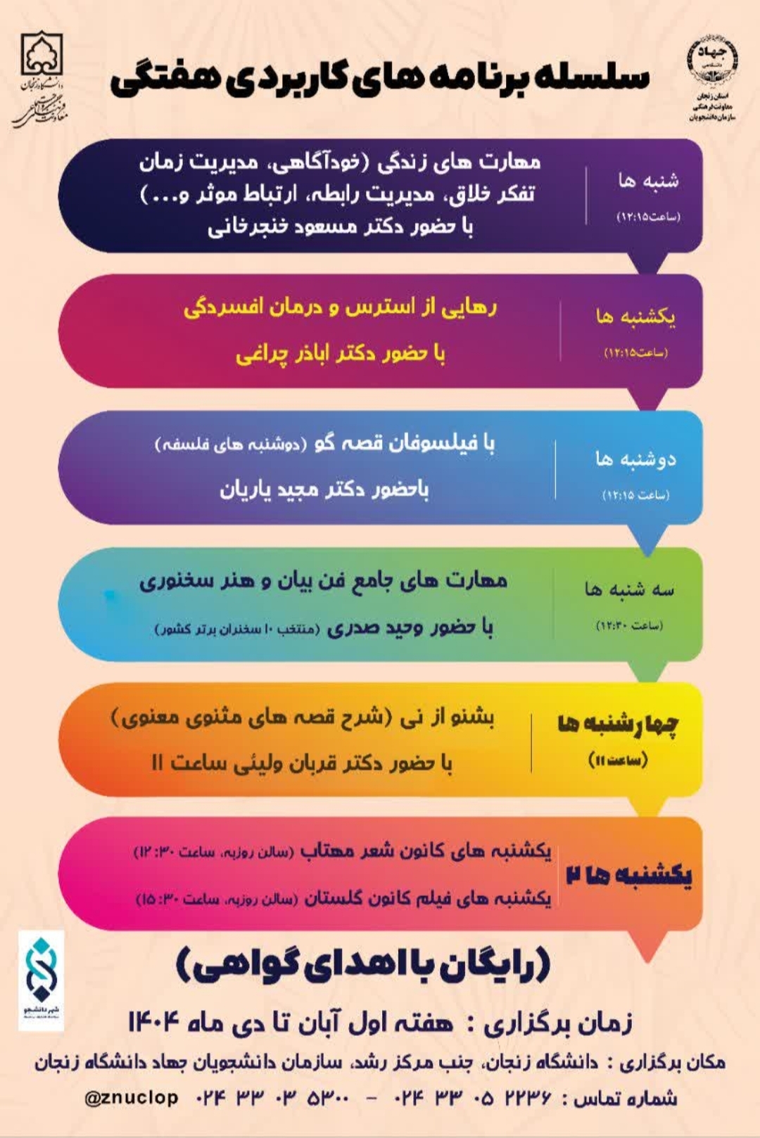 تمامی کارگاهها به غیر از کارگاه روز سه شنبه « مهارتهای فن بیان» رایگان بوده و شرکت کنندگان برای حضور و بهره مندی از گواهی حضور لازم است در سایت شهر دانشجو ثبت نام کنند.