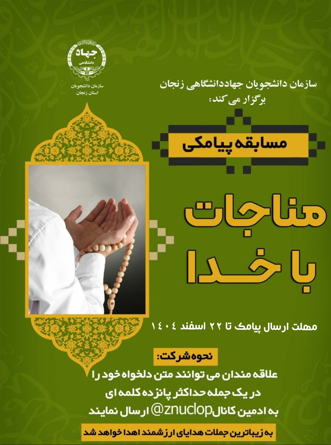 علاقه مندان می توانند متن دلخواه خود را در یک جمله حداکثر پانزده کلمه ای به ادمین کانالznuclop@ ارسال نمایند