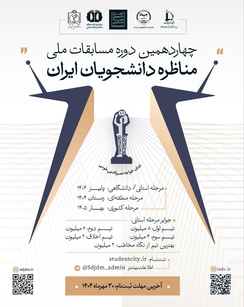 ثبت نام چهاردهمین دوره مسابقات مناظره دانشجویان ایران آغاز شد! ✻ مرحله استانی/ دانشگاهی: پاییز ۱۴۰۴ مرحله منطقهای: زمستان ۱۴۰۴ مرحله کشوری: بهار ۱۴۰۵ مهلت ثبت نام: تا ۳۰ مهرماه ۱۴۰۴ جوایز مرحله استانی: