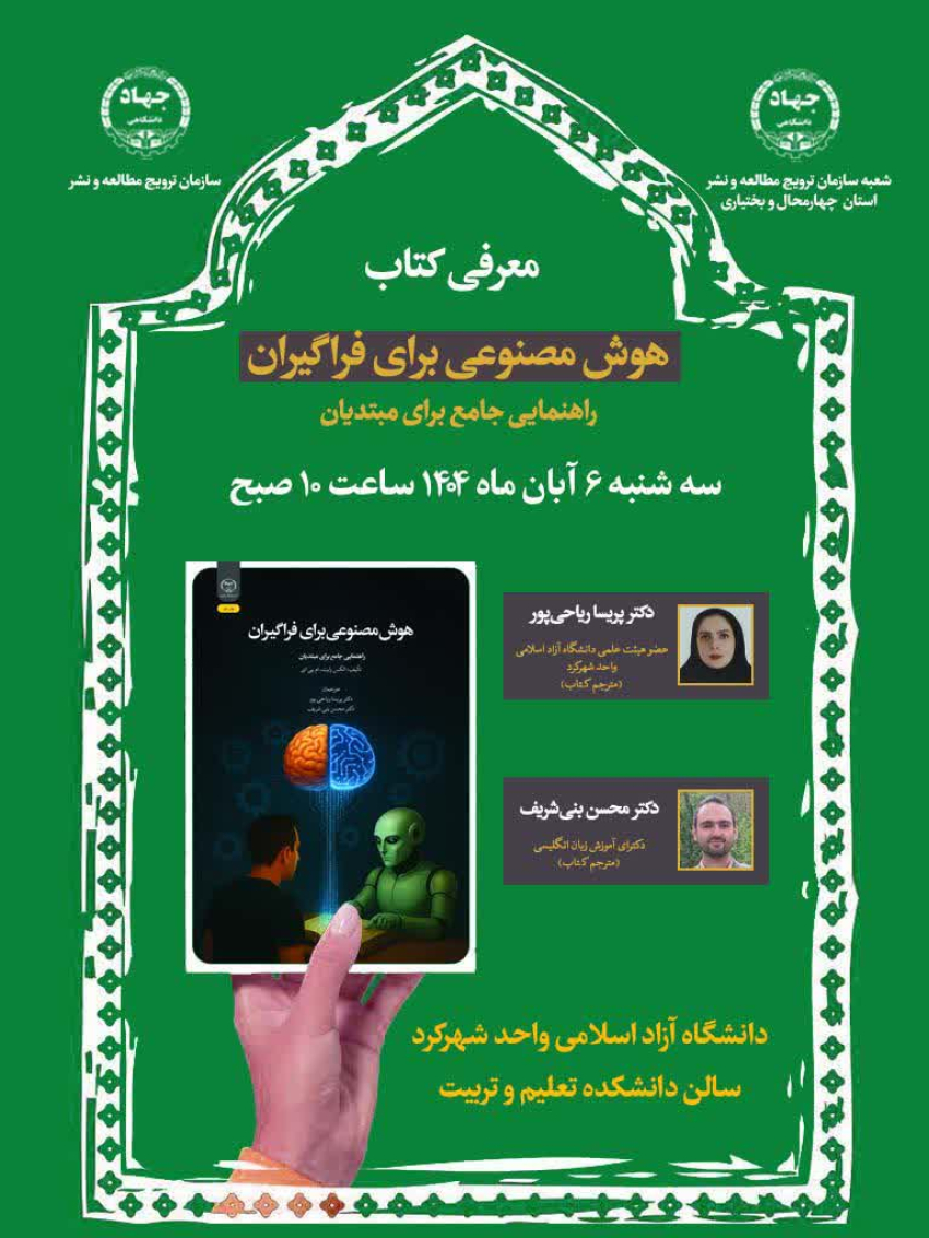 آیین معرفی کتاب «هوش مصنوعی برای فراگیران (دانش آموزان و دانشجویان بیش از 500 دستور / هوش مصنوعی برای موفقیتهای علمی» به مناسبت هفته کتاب و کتابخوانی و به همت شعبه سازمان انتشارات جهاد دانشگاهی با حضور دانشجویان و علاقهمندان به کتاب در سالن دانشکده تعلیم و تربیت دانشگاه آزاد اسلامی واحد شهرکرد برگزار شد.