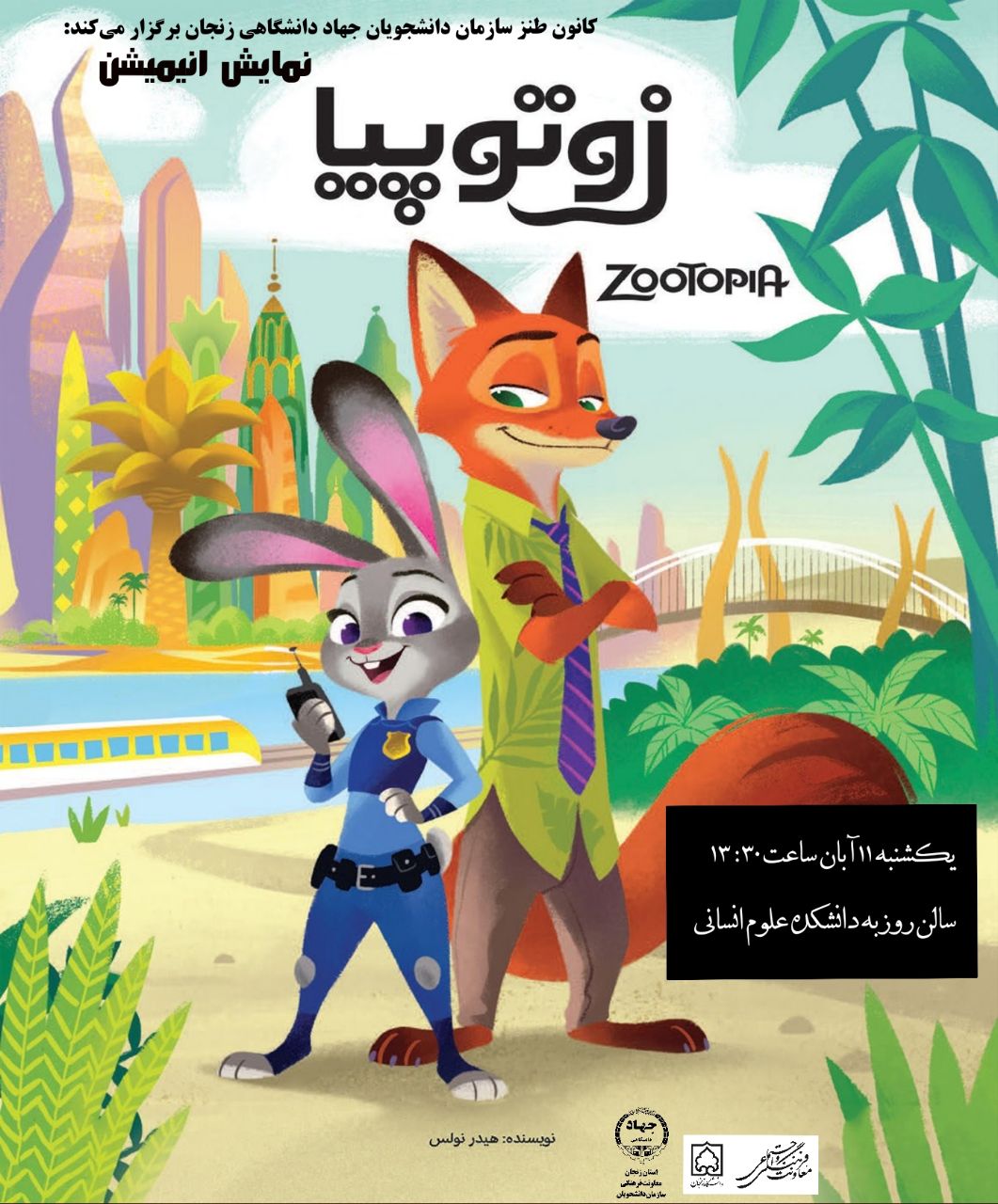 کانون طنز سازمان دانشجویان جهاد دانشگاهی زنجان برگزار میکند:نمایش انیمیشن زوتوپیایکشنبه ۱۱ آبانساعت ۱۳:۳۰سالن روزبه دانشکده علوم انسانی دانشگاه زنجان@znuclop