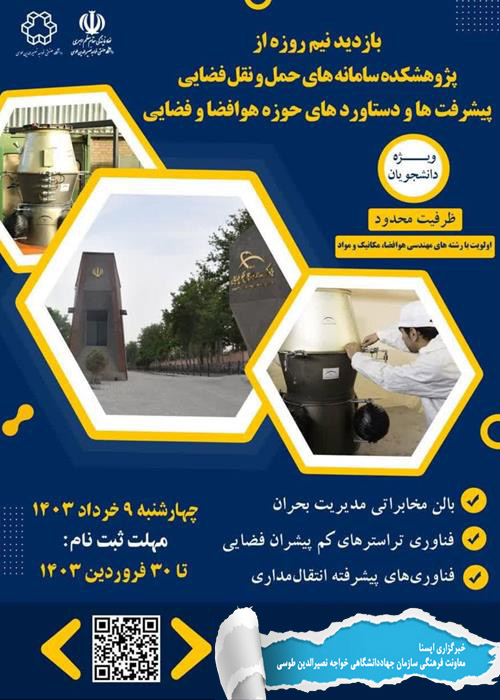 در بازدید نیم روزه از پژوهشکده سامانه های حمل و نقل فضایی قرار است دانشجویان گرامی با پیشرفت ها و دستاورد های حوزه هوافضا و فضایی آشنا خواهند شد.