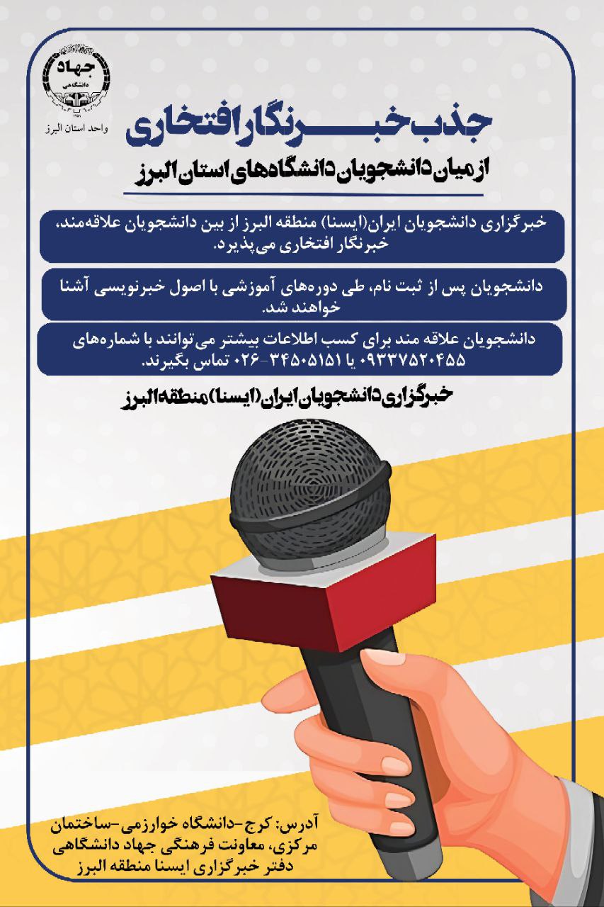 خبرگزاری دانشجویان ایران(ایسنا) منطقه البرز با هدف گسترش فعالیتهای رسانهای و فراهمکردن زمینه مشارکت دانشجویان علاقهمند به حوزه خبر، فراخوان جذب خبرنگار افتخاری را منتشر کرد که در پی آن، جمعی از دانشجویان دانشگاههای مختلف استان برای همکاری اعلام آمادگی و در این دوره شرکت کردند.
