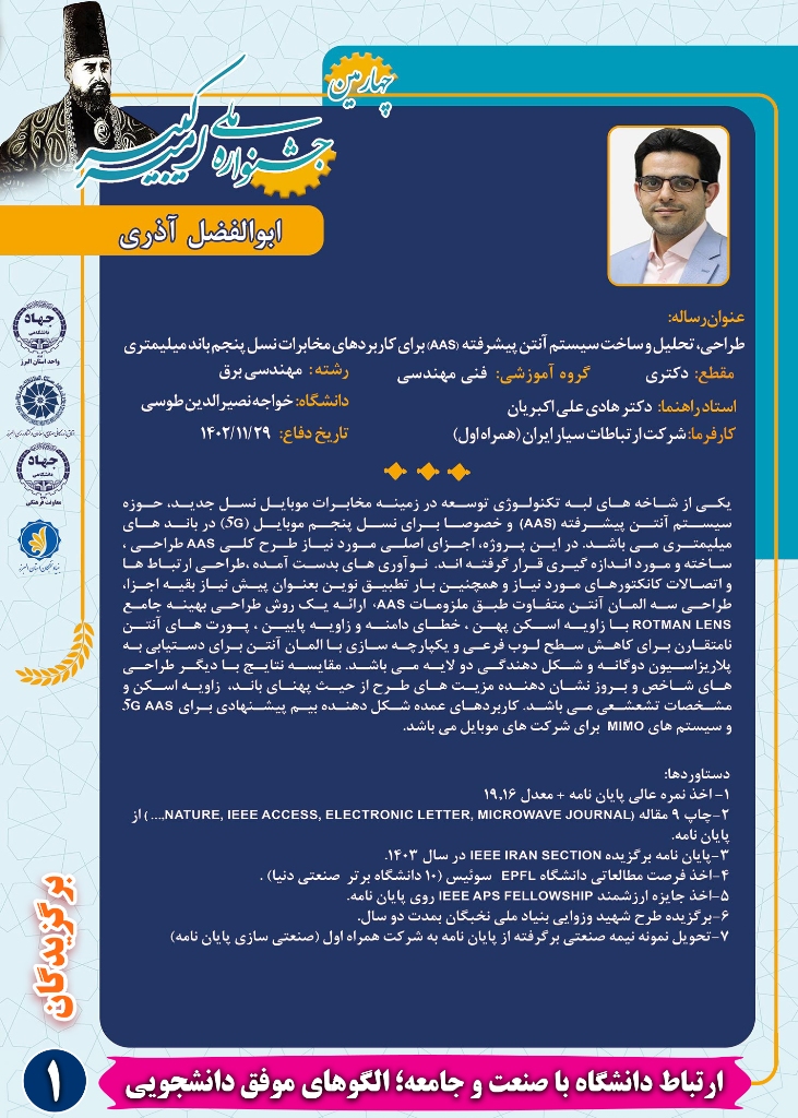 عنوان رساله: طراحی، تحلیل و ساخت سیستم آنتن پیشرفته (AAS) برای کاربردهای مخابرات نسل پنجم باند میلیمتری