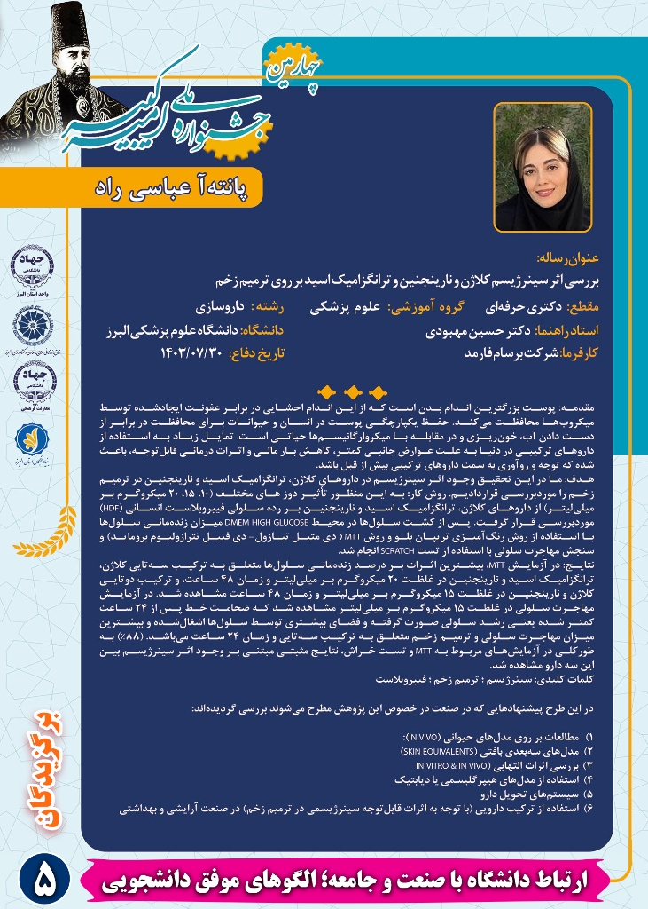 نتایج: در آزمایش MTT، بیشترین اثرات بر درصد زندهمانی سلولها متعلق به ترکیب سهتایی کلاژن، ترانگزامیک اسید و نارینجنین در غلظت ۲۰ میکروگرم بر میلیلیتر و زمان ۴۸ ساعت، و ترکیب دوتایی کلاژن و نارینجنین در غلظت ۱۵ میکروگرم بر میلیلیتر و زمان ۴۸ ساعت مشاهده شد. در آزمایش مهاجرت سلولی در غلظت ۱۵ میکروگرم بر میلیلیتر مشاهده شد که ضخامت خط پس از ۲۴ ساعت کمتر شده یعنی رشد سلولی صورت گرفته و فضای بیشتری توسط سلولها اشغالشده و بیشترین میزان مهاجرت سلولی و ترمیم زخم متعلق به ترکیب سهتایی و زمان ۲۴ ساعت میباشد. (۸۸٪) بهطورکلی در آزمایشهای مربوط به MTT و تست خراش، نتایج مثبتی مبتنی بر وجود اثر سینرژیسم بین این سه دارو مشاهده شد.