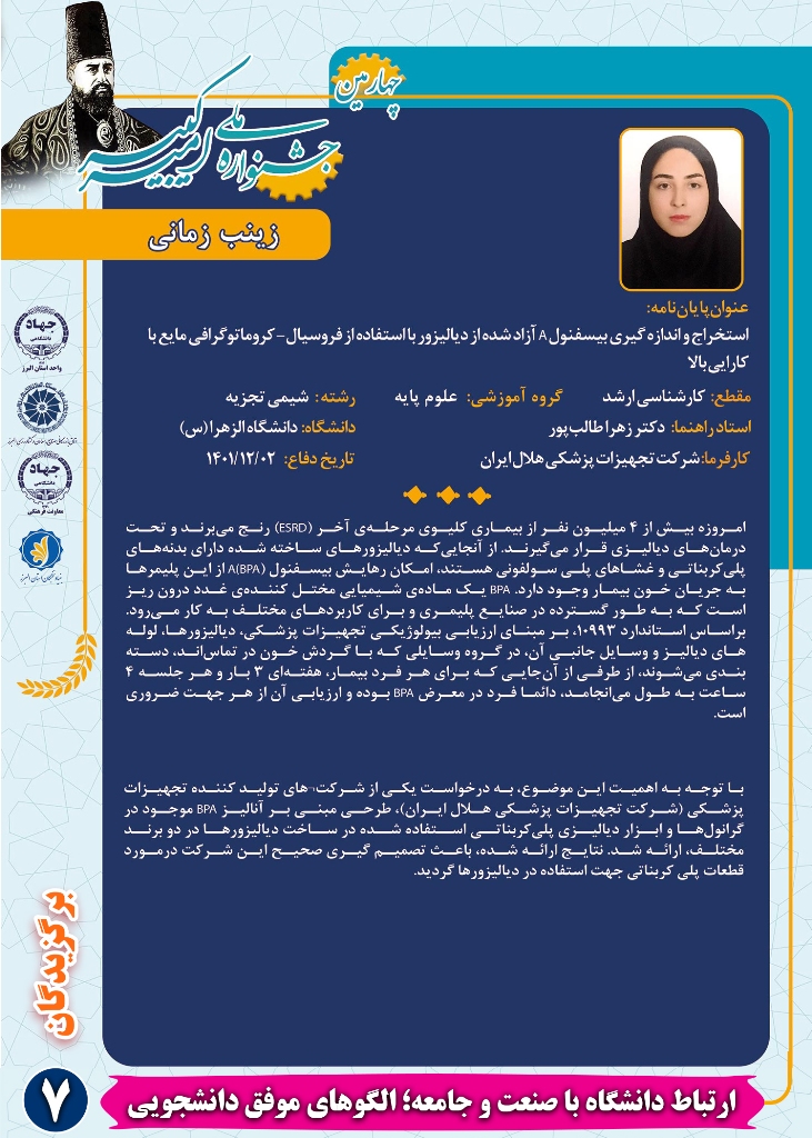 عنوان پایاننامه: استخراج و اندازه گیری بیسفنول A آزاد شده از دیالیزور با استفاده از فروسیال- کروماتوگرافی مایع با کارایی بالا
