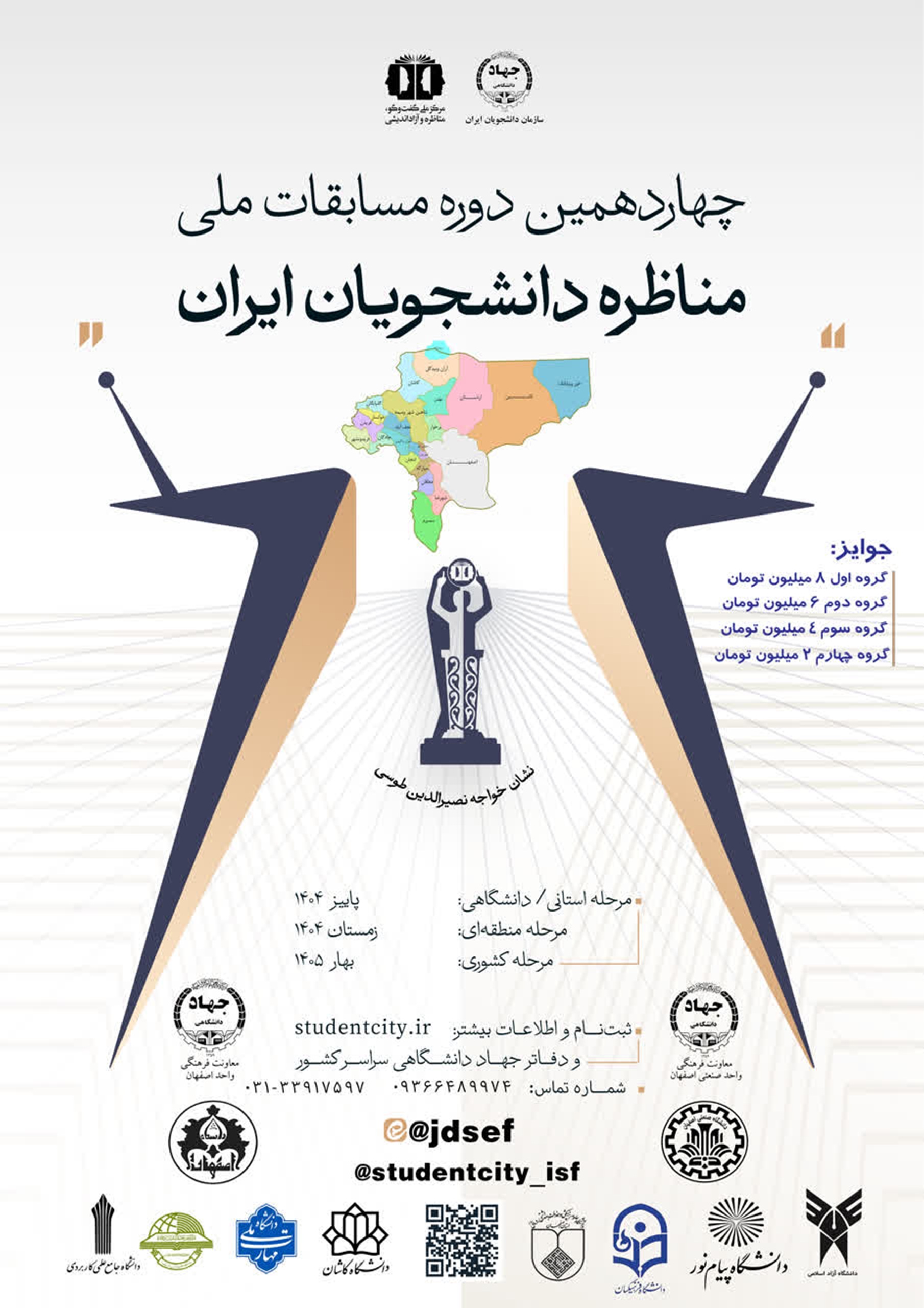 سازمان دانشجویان جهاد دانشگاهی واحدهای اصفهان و صنعتی اصفهان، فراخوان ثبت نام در مرحلۀ استانی چهاردهمین دورۀ مسابقات ملی مناظرۀ دانشجویان ایران را منتشر کردند. دانشجویان سراسر استان اصفهان تا پایان آبان ماه فرصت دارند با مراجعه به نشانی https://studentcity.ir نسبت به ثبت نام اقدام کنند.