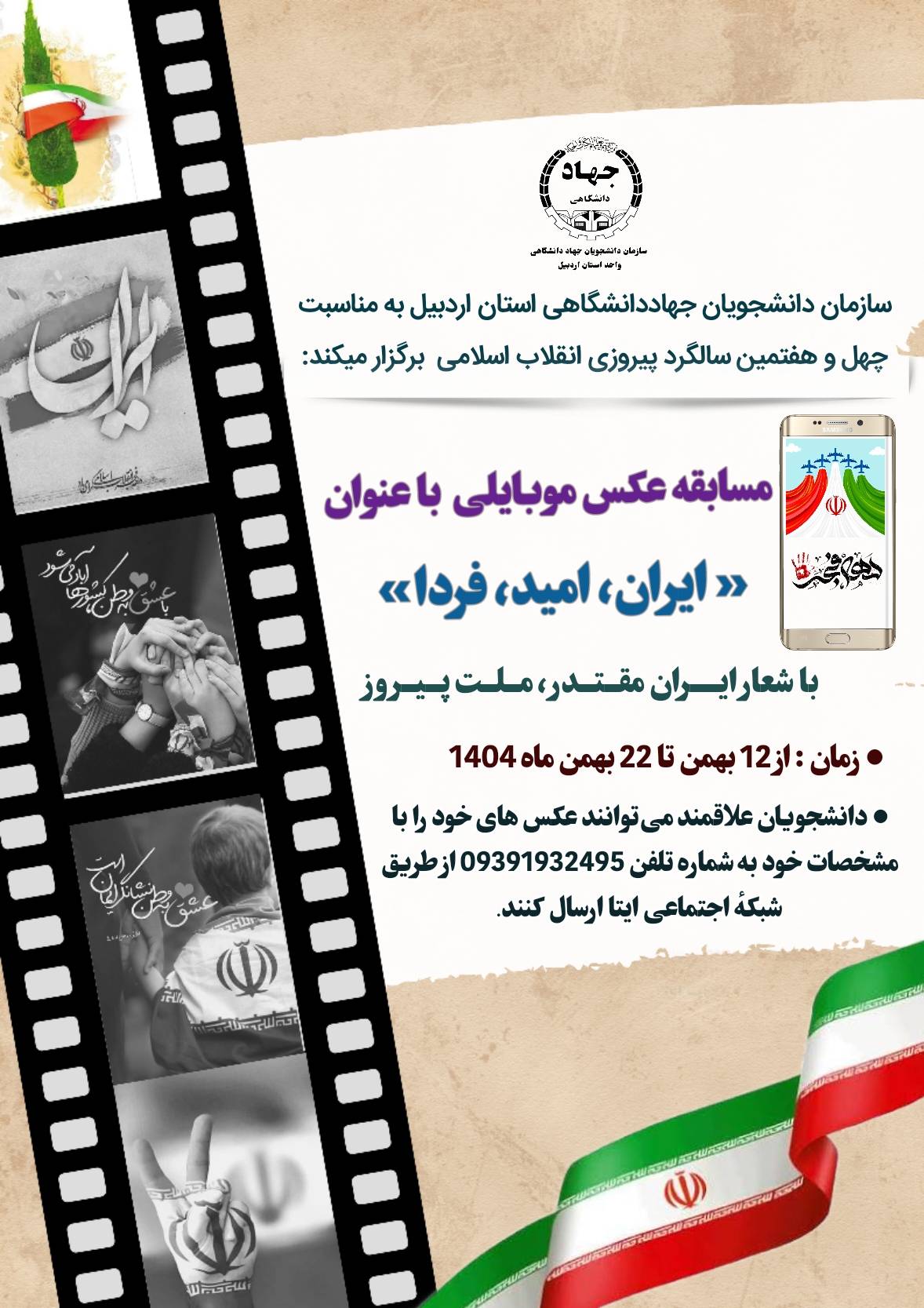 سازمان دانشجویان جهاددانشگاهی استان اردبیل به مناسبت چهل و هفتمین سالگرد پیروزی انقلاب اسلامی برگزار میکند: