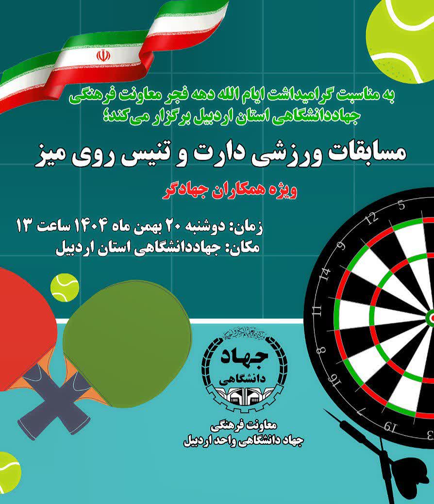 معاونت فرهنگی مسابقات ورزشی به مناسبت ایام پیروزی شکوهمند انقلاب اسلامی و دهه مبارک فجر ویژه جهادگران واحد به شرح ذیل برگزار میکند: