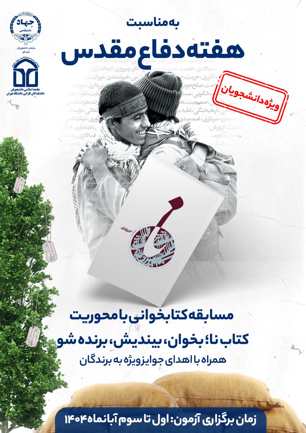 به مناسبت هفته دفاع مقدس مسابقه کتابخوانی با محوریت کتاب نا؛ بخوان، بیندیش، برنده شو زمان مسابقه: پنج شنبه اول تا سوم آبان ماه همراه با اهدای جوایز ویژه به برندگان ویژه دانشجویان