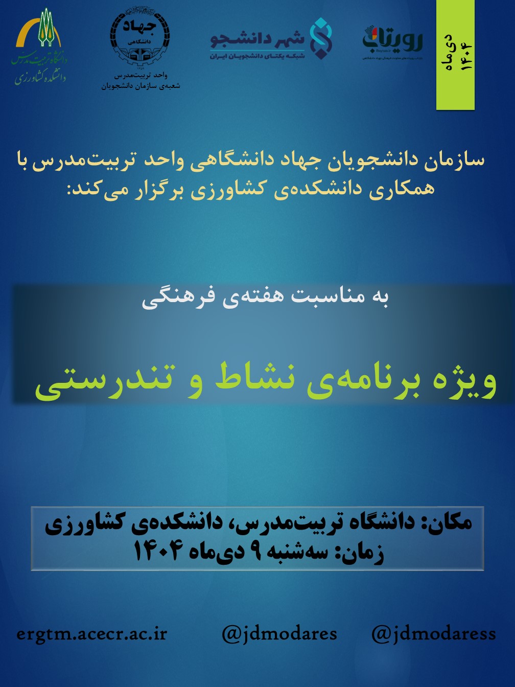 سازمان دانشجویان جهاد دانشگاهی واحد تربیتمدرس با همکاری دانشکدهی کشاورزی در نظر دارد برنامهای در قالب مسابقههای متنوع ورزشی برگزار کند.
