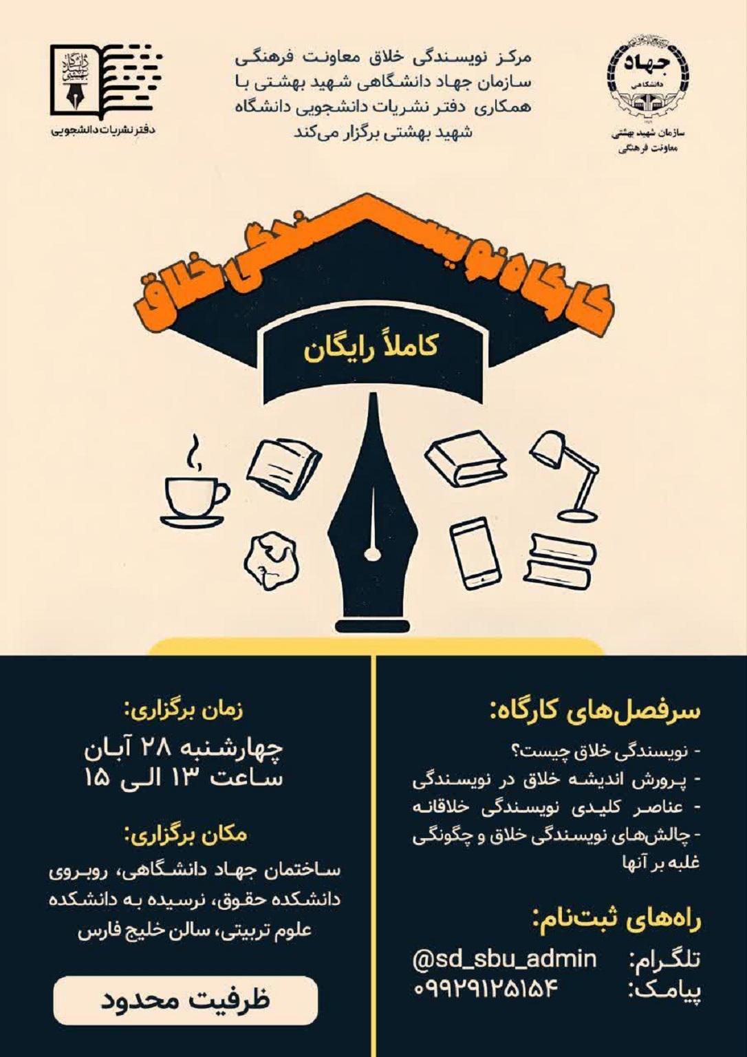 کارگاه نویسندگی با مشارکت دفتر نشریات دانشجویی دانشگاه کارگاه نویسندگی را برگزار خواهد کرد.