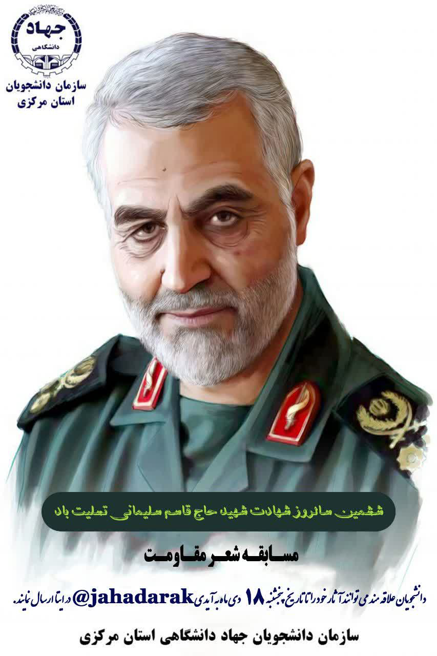در آستانه شهادت شهید سردار حاج قاسم سلیمانی، مسابقه شعر مقاومت به همت کانون ادبی سازمان دانشجویان جهاد دانشگاهی استان مرکزی برگزار خواهد شد.
