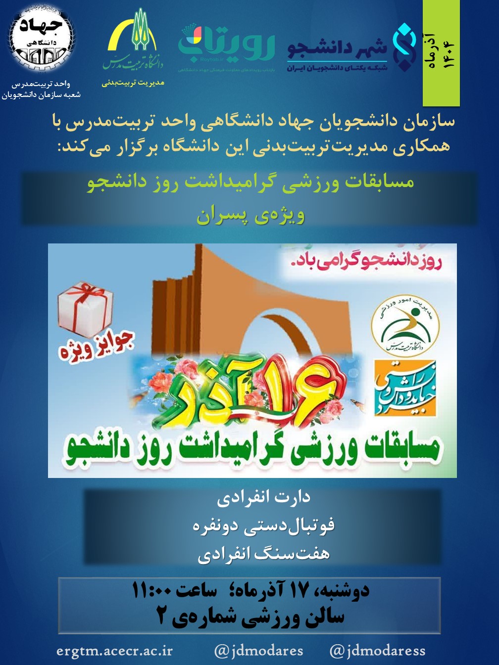 جهاد دانشگاهی واحد تربیتمدرس با همکار مدیریت تربیتبندی این دانشگاه درنظر دارد تا به مناسبت روز دانشجو، برنامههای پرنشاطی در قالب مسابقات دانشجویی برگزار کند. این برنامهها شامل مسابقات دارت انفرادی، فوتبال دستی دونفره و هفتسنگ انفرادی خواهد بود.