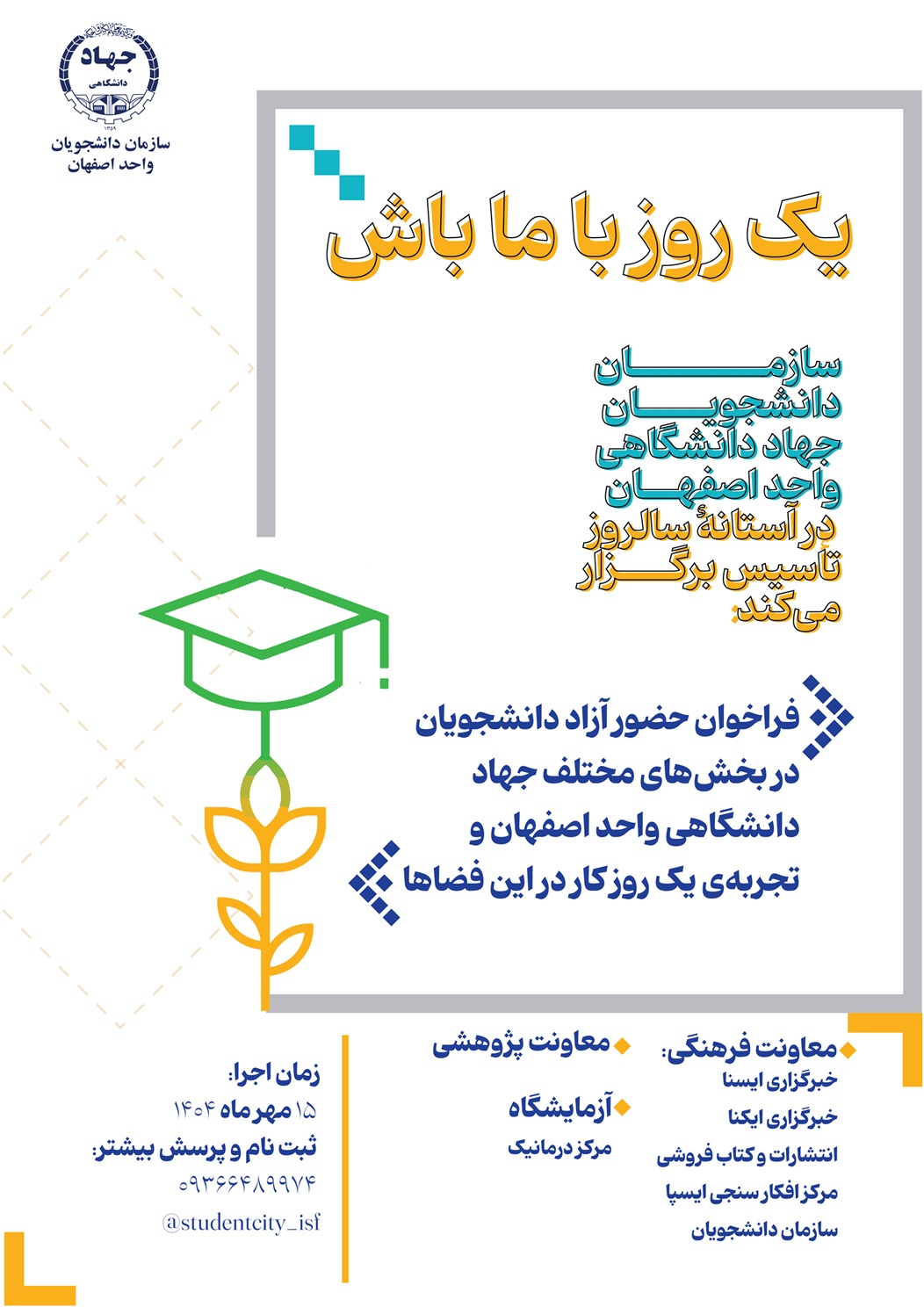 دانشجویان میتوانند با ثبتنام در این فراخوان، 15 مهر ماه تجربه حضور یک روزه در یکی از بخشهای جهاد دانشگاهی واحد اصفهان را داشته باشند.