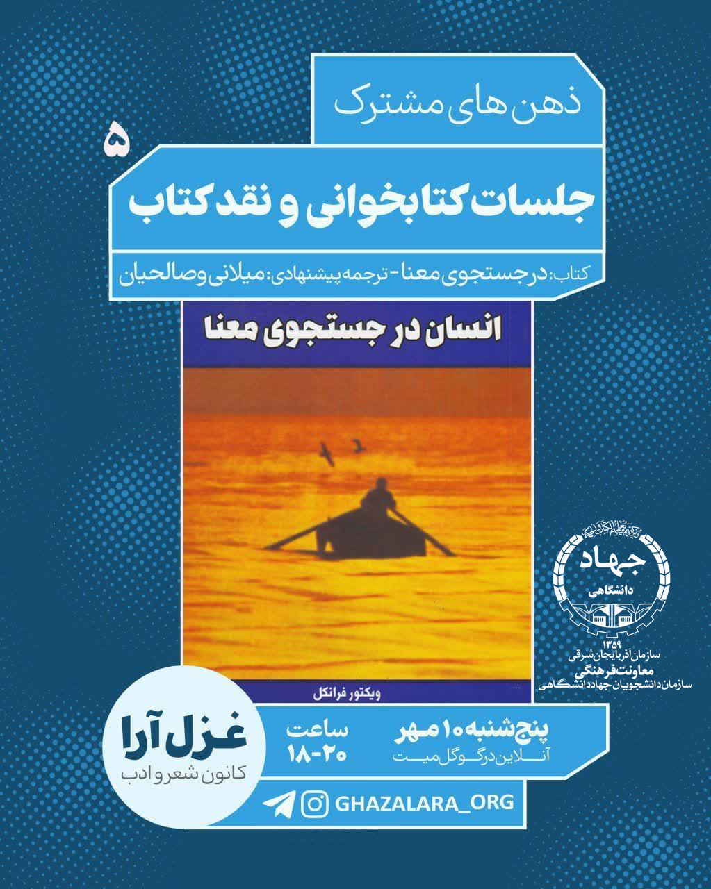 پنجمین جلسه کتابخوانی و نقد کتاب ذهن های مشترک با مضوع کتاب «انسان در جستجوی معنا» فردا یکشنبه، ساعت ۱۶ تا ۱۸ در سینمای جهاد دانشگاهی دانشگاه سراسری تبریز برگزار میشود